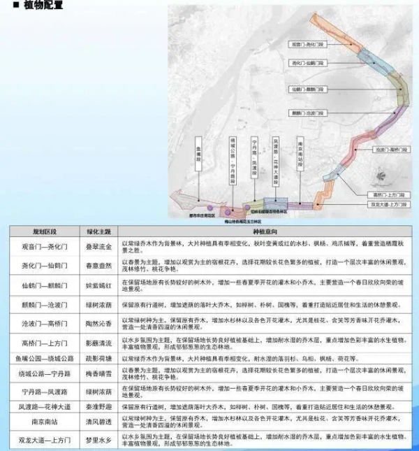 在植物配置上,明外郭本体两侧用不少于 3 排高大挺拔的行道树勾勒郭体轮廓,或者在距离郭体 50 米处的红线内不少于 3 排行道树。秦淮新河段,则建设三处特色植物景观区。
