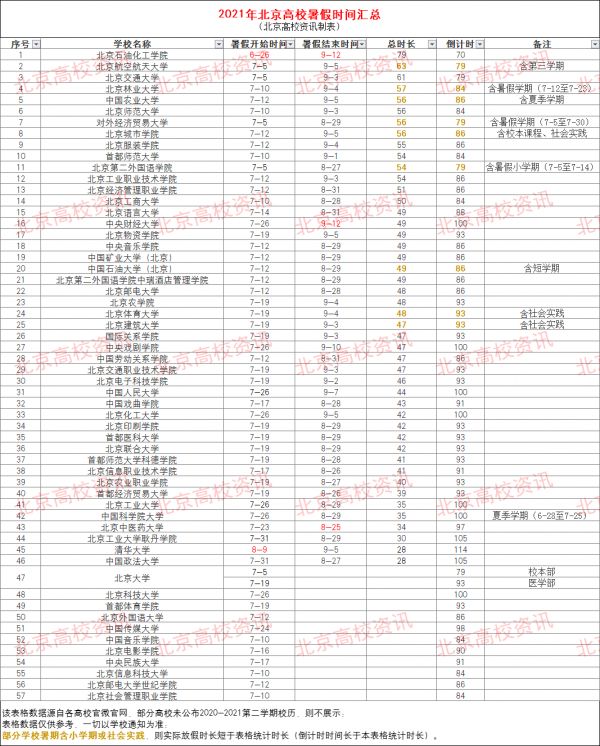 从表格统计数据来看,2021年的暑假,大部分学校的放假时间在7月左右,只有北京石油化工学院在6月就放假!而暑假结束时间,多数在8月底,暑假时长基本在30天以上。