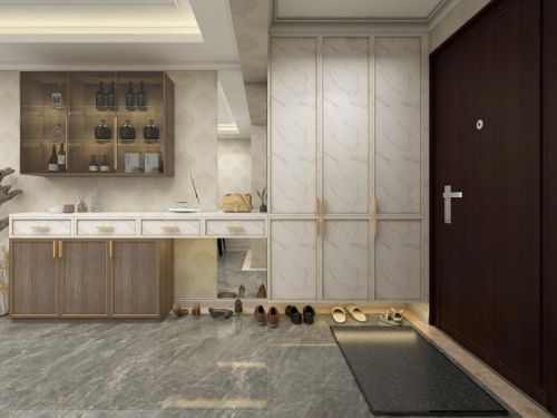餐厅:餐边柜酒柜鞋柜一体设计;进门通顶鞋柜,下方保留常穿鞋子放置空间;左边下方台面+柜子的设计,方便酒水饮料操作及餐盘放置;左边上方玻璃酒柜,既是装饰柜亦是酒柜。