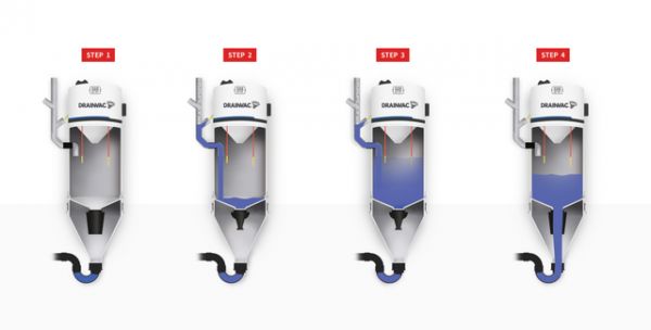 如图中所示,在启动时管道内的灰尘进入主机后,水阀会自动打开,水阀与灰尘混合后会囤积在主机内部,当水位达到一定高度触碰电极后,设备会自动暂停,将内部的污水排入下水道。排完污水后即可继续使用,所以在清洁全程我们都无需触及污渍,不用像传统的吸尘器每次清洁完都要清理集尘袋,造成二次污染。设备内的滤网一年清理一次即可。