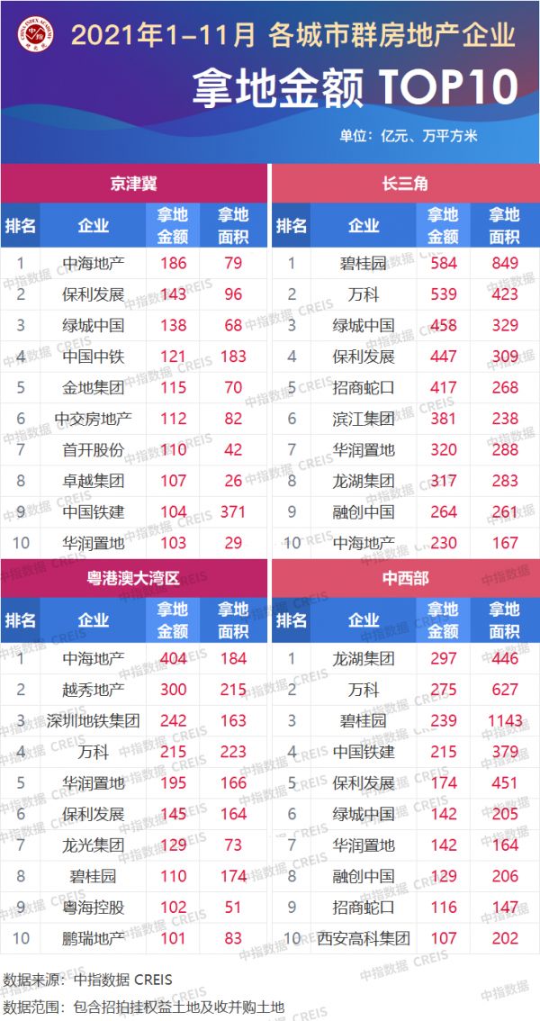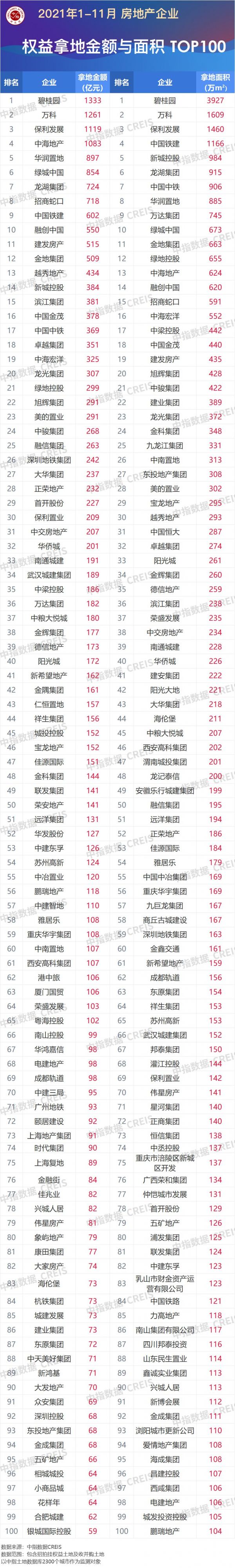 2021年1-11月房地产企业拿地TOP100:拿地总额2.35万亿元同比降17.7%