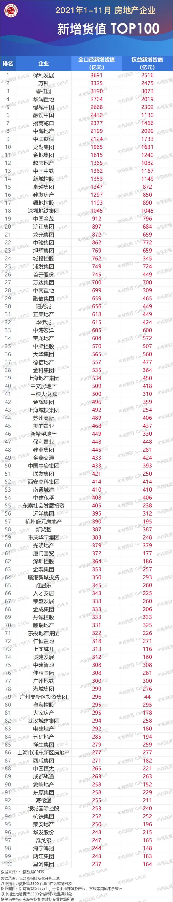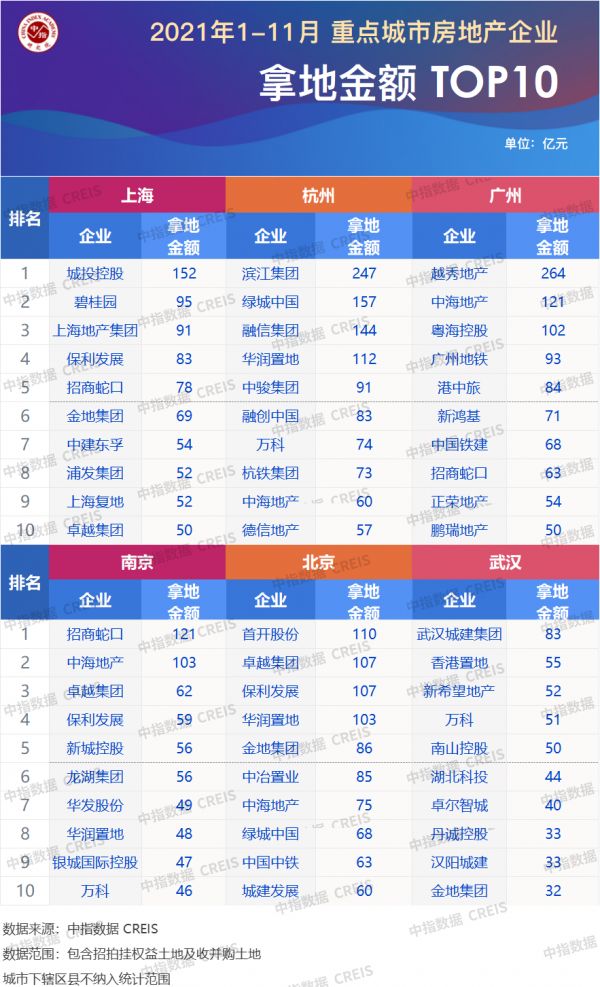 2021年1-10月房地产企业拿地TOP100