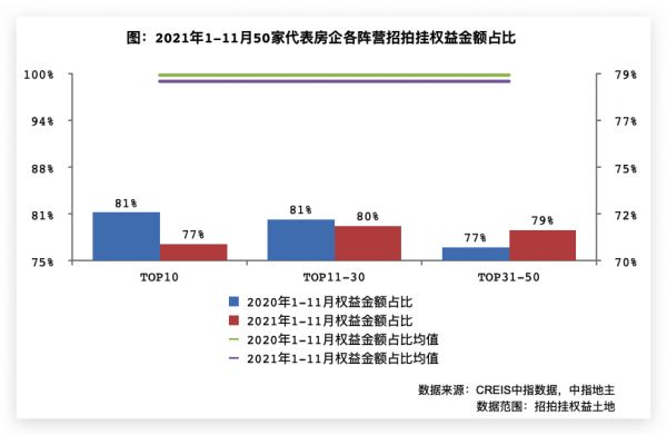 50家代表房企招拍挂拿地权益金额占比略有下降。2021年1-11月,50家代表房企招拍挂权益金额占比均值为78.9%,较同期微降0.3个百分点,合作拿地力度基本保持稳定。具体来看,与去年同期相比,1-11月前10阵营企业、11-30阵营企业拿地权益金额占比均值同比均有所下降,31-50阵营企业拿地权益金额占比有所上升。