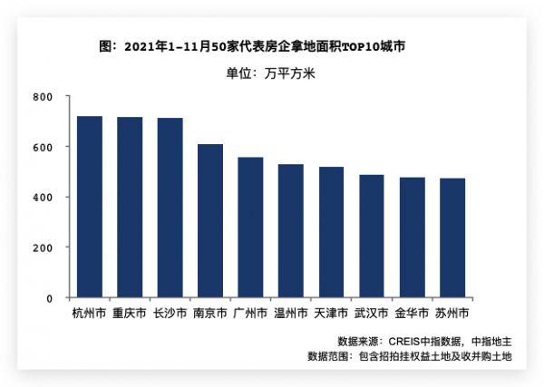 杭州、重庆及长沙位列代表房企拿地面积前三城市。2021年1-11月,50家代表房企拿地面积TOP10城市中,杭州累计拿地面积位列第一,重庆和长沙占据二、三位,继续以累积优势保持前三。整体来看,相较1-10月,前十城市相同,累计优势明显。