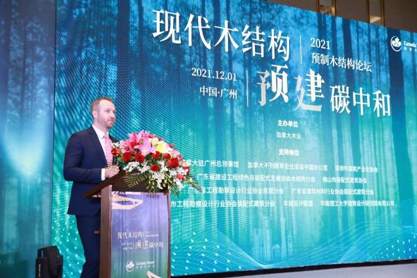 加拿大驻广州总领事馆副总领事、高级商务专员封安霆先生发表致辞,他谈到在加拿大木材产品和建筑领域,加拿大木业是加拿大驻广州总领事馆的重要合作伙伴。加拿大森林资源丰富,在建筑行业处于领先地位,创新的冷却技术、智能建造技术,绿色建筑建造工艺等先进技术的运用旨在打造健康舒适的建筑。第26届联合国气候变化大会刚落下帷幕,各国致力于寻找缓解气候变化的办法。加拿大目前有超过3200座LEED认证的项目,政府逐渐意识到绿色建筑是实现低碳目标的重要途径,中国和加拿大同样致力于可持续建筑的发展。加拿大木业从推动建筑规范标准的编订到示范项目的建立,证明了加拿大木结构建筑技术在中国的适用性。希望通过今天的论坛,能够促进中加木材贸易发展,共建可持续的未来。