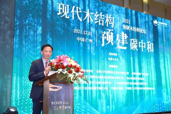 加拿大木业中国区执行总裁黄华力先生发表致辞,他谈到2021年是非比寻常的一年,全球气候变化未因新冠疫情而止步,国内外都遭遇了不同程度的灾害,各国政府也意识到发展低碳建筑的重要性。2030碳达峰和2060碳中和目标对建筑业既是挑战也是机遇。全球建筑行业碳排放占碳排放总量40%, 是推进节能减排的重点领域。现代木结构节能环保,助力低碳经济发展。加拿大木业总部在温哥华,在全球多个国家设有办事处,通过技术咨询、建立示范项目、商务考察等搭建木结构的信息交流平台,通过加强政企合作,共同推动国内木结构的发展。希望未来能够在华南建筑领域,深化交流合作,促进绿色低碳经济的发展,为碳中和做出贡献。