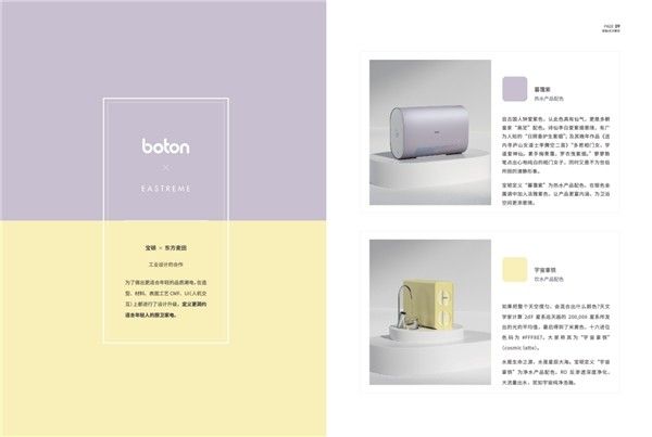 在与东方麦田的战略合作项目中,宝顿产品在ID造型、CMF(颜色、材料、表面工艺)、UI交互界面等方面均进行了定义升级,打开新的成长空间。品牌打造“暮霭紫”为热水系列色和“宇宙拿铁”为净水系列色,用鲜明产品形象铸就品牌基调。