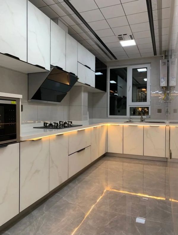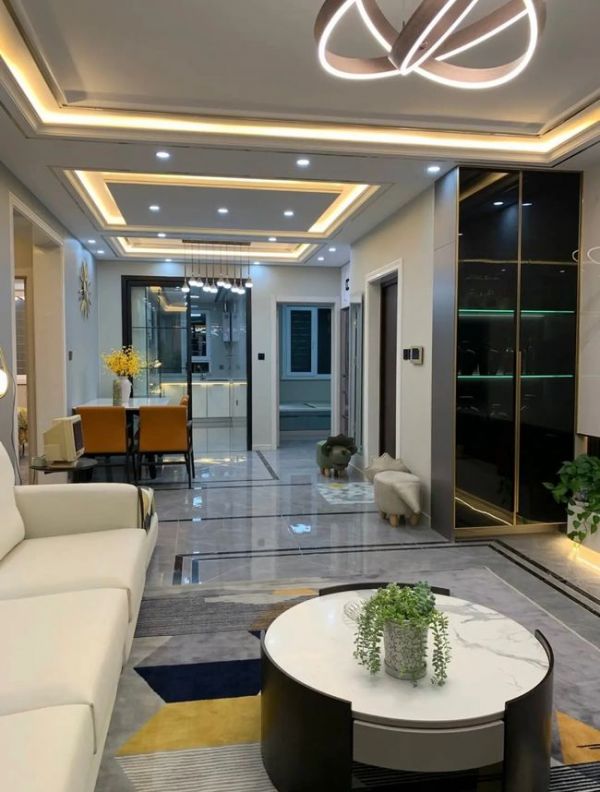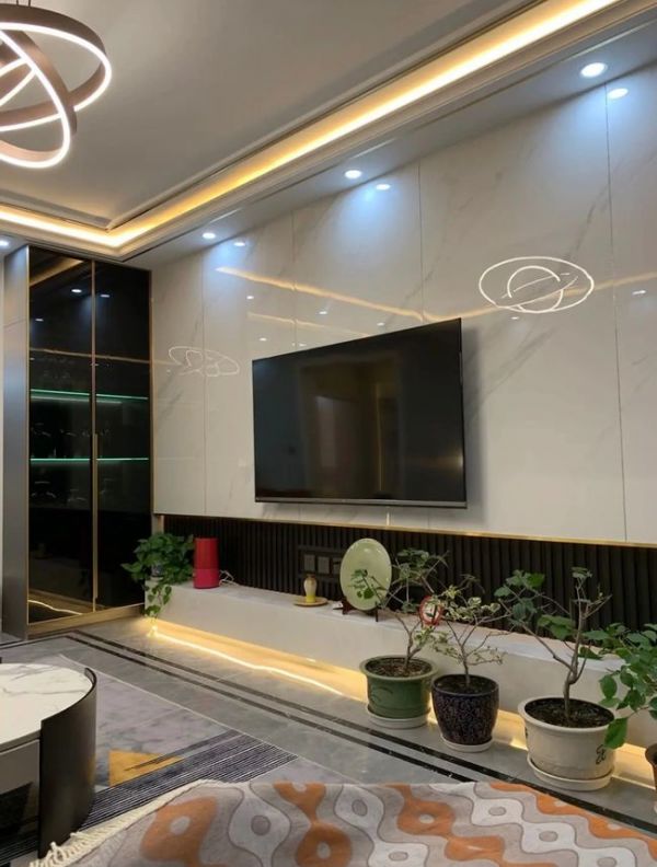 装修色调白色和浅灰,搭配黑色为辅助色。吊顶的钛金、电视墙一侧的黑玻璃柜门、电视墙瓷砖沙发茶几的岩板瓷砖,分别增添了不一样的质感。