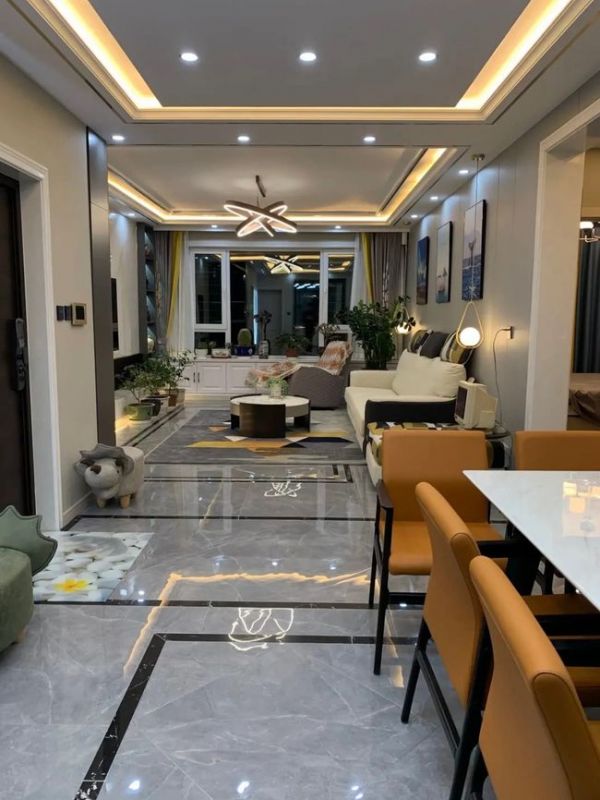 房子风格介于轻奢+简约欧式,地面和吊顶根据区域独立划分,地面用波导线分割。吊顶单层级灯池,侧面贴石膏线,下层板和天花分别镶嵌钛金线条。墙面大面积浅蓝灰墙漆,沙发墙悬挂装饰画,电视墙是定制微晶石瓷砖+木格栅,悬浮石材电视柜。