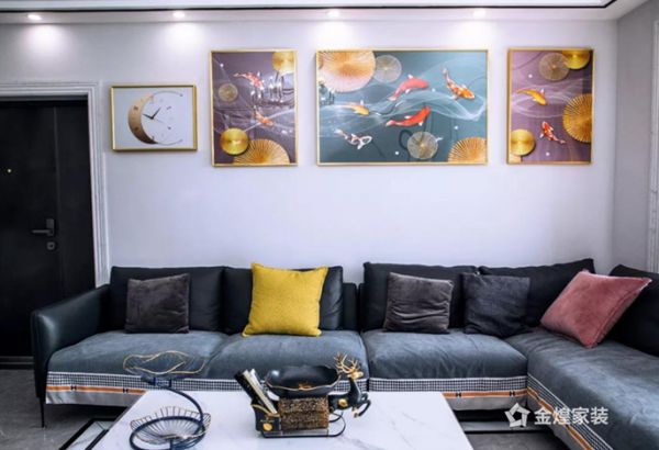 灰色皮质沙发搭配鲜艳活泼的抱枕,沙发上方一组富有意境的装饰挂画,茶几的岩板台面上布置上金属小摆饰、杂志,为空间带来一种优雅与舒适的高级感。