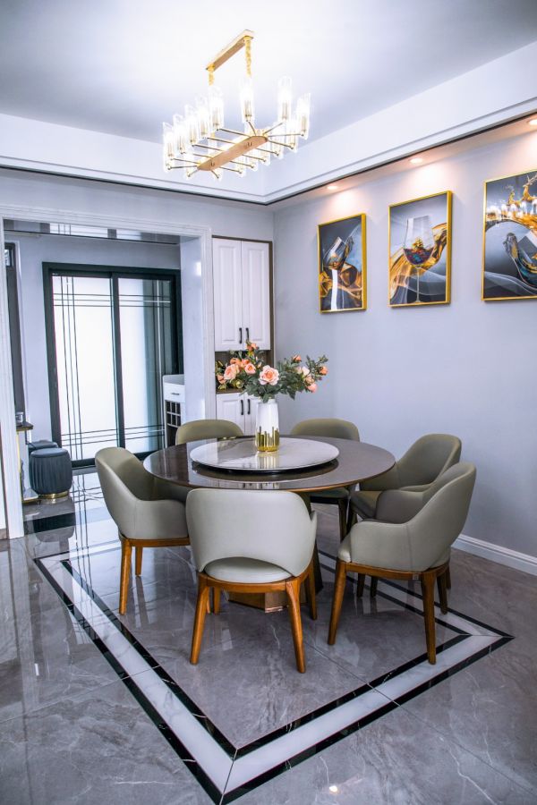胡桃木色的餐桌,结合棕色皮艺餐椅,配合造型灯饰凸显吊顶空间,与餐桌上的插花相呼应,使业主感受到明亮活泼的用餐氛围感。