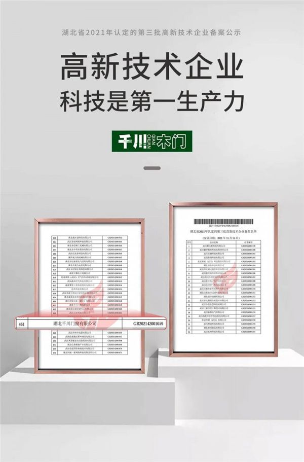 新浪门窗频道讯 近日,湖北千川门窗有限公司通过高新技术企业复审,入围湖北省认定管理机构2021年认定的第三批2010家高新技术企业备案名单。