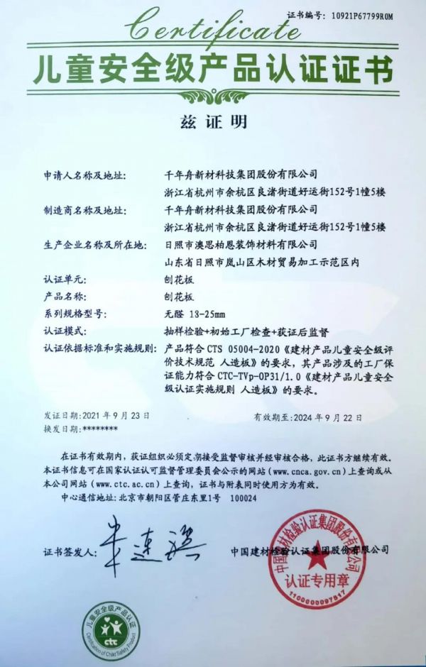 近日,千年舟集团旗下可饰面定向刨花板(LSB高能家居板)产品、刨花板(澳松板)产品经过一系列严格的审查及评审,凭借自身强大的品牌实力与健康环保的产品,顺利通过《儿童安全级产品认证》,并取得相关证书。