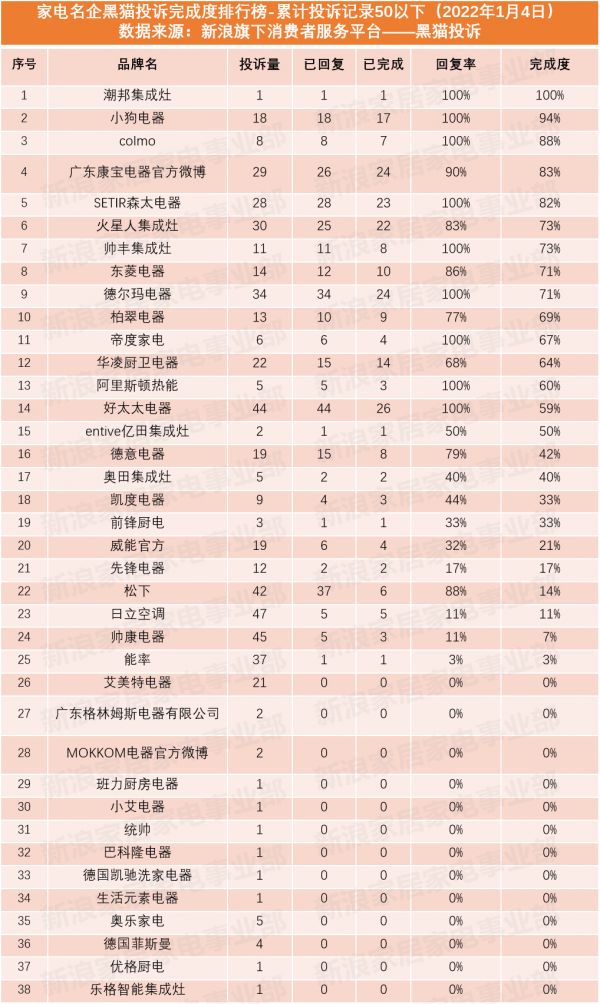 家电名企黑猫投诉完成度排行榜 60%完成度企业不足五成(2022年1月4日数据)