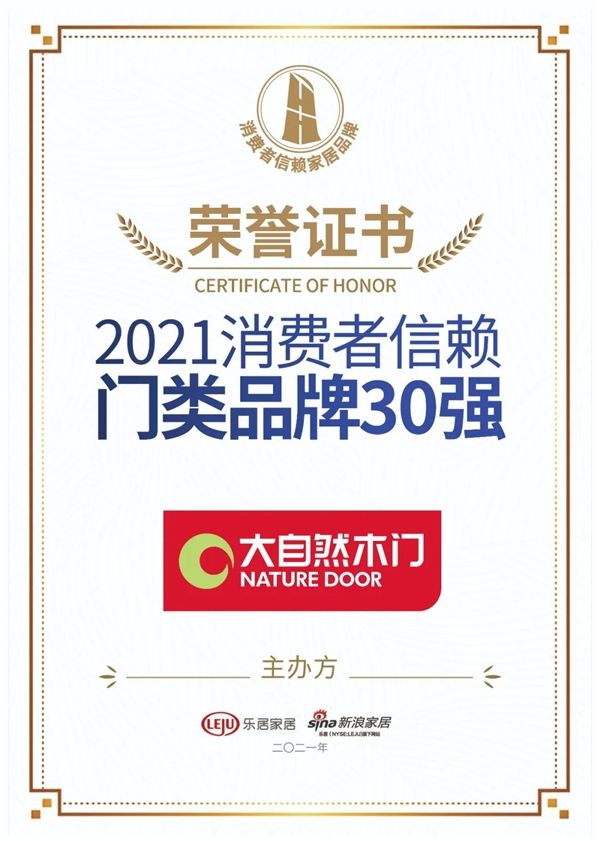 感谢信赖,大自然木门荣获《2021消费者信赖门类品牌30强》