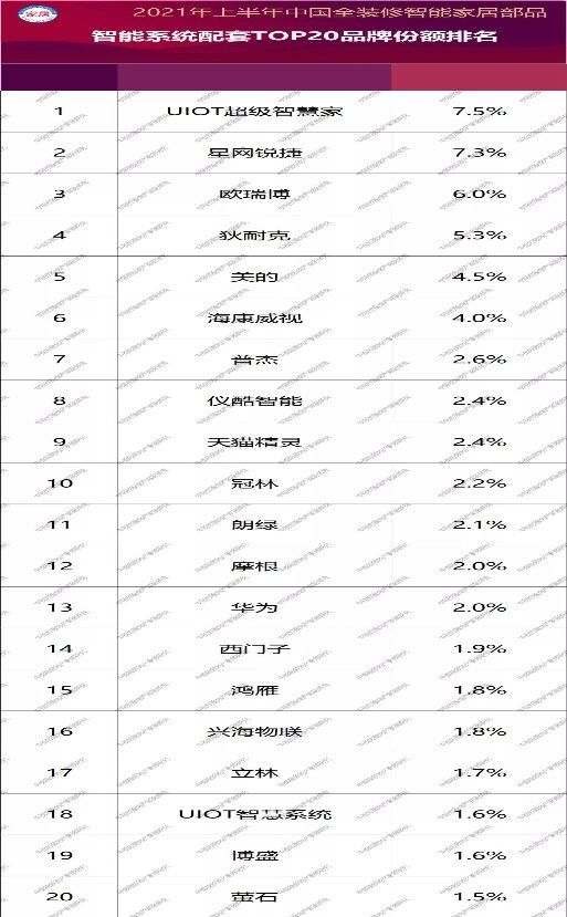 中指控股数据显示,在中国全装修智能家居系统排名中,UIOT超级智慧家以7.5%的市场份额高居榜首,欧瑞博以6.0%的市场份额排在第三位,而美的、华为则分别位于第五和第十三位,绿米未上榜。