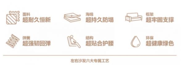 左右沙发几十年专注于沙发,致力于打造高质量沙发、高舒适度沙发,积累六大专属工艺,从面料、海绵、框架、弹簧、结构、环保六大方面实现全面升级,给每一个选择左右沙发的幸福家庭带去更高品质的沙发产品。