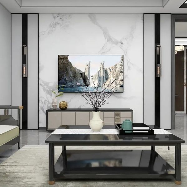 客厅电视背景墙选择干净简约的大理石背景,最大程度释放空间。深杰色的茶几既简约又磊气,整个客厅看起来有着绝佳的通透感。