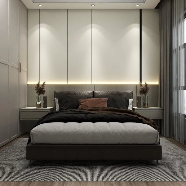 主卧背景墙设计与衣柜色系一致,有着独特的设计格调。卧室整墙的收纳衣柜,干净简练又不失浪漫,时刻都充满淡淡的温意。