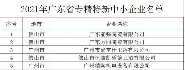 近日,广东省工业和信息化厅公布2021年广东省专精特新中小企业名单,1459家企业获认定。其中,广东能强陶瓷有限公司、广东方向陶瓷有限公司、广州市尚雷仕卫浴有限公司、佛山市恒洁凯乐德卫浴有限公司、广州精陶机电设备有限公司等5家陶瓷卫浴及相关企业上榜。