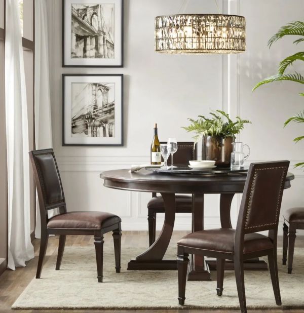 如果餐厅中是圆餐桌,也可以选择尺圆形吊灯搭配,灯的直径尺寸推荐在餐桌的1/2-3/4之间。