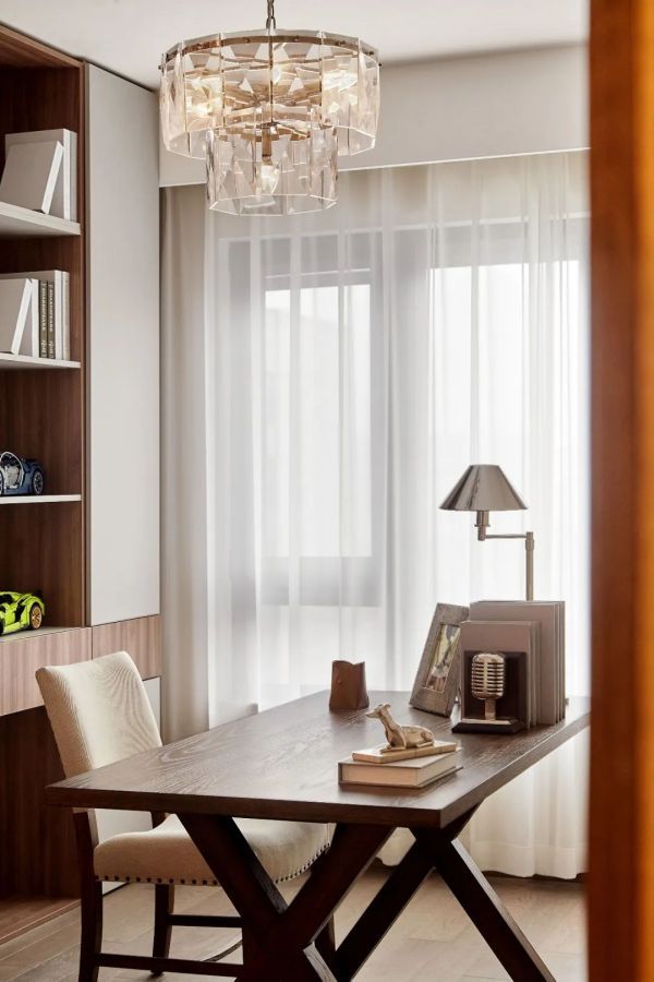 书房一般最多会搭配3盏灯,一个主灯、一个落地灯和一个书桌灯。主灯和落地灯不宜过亮,满足书房内日常活动的光照需求就行,以便人能注意精力到书桌局部照明的环境中。