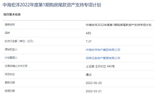 债券类别为ABS,拟发行金额7.37亿元,原始权益人为中海宏洋地产集团有限公司,计划管理人为招商证券(600999)资产管理有限公司,交易所确认文件文号为上证函【2022】945号。
