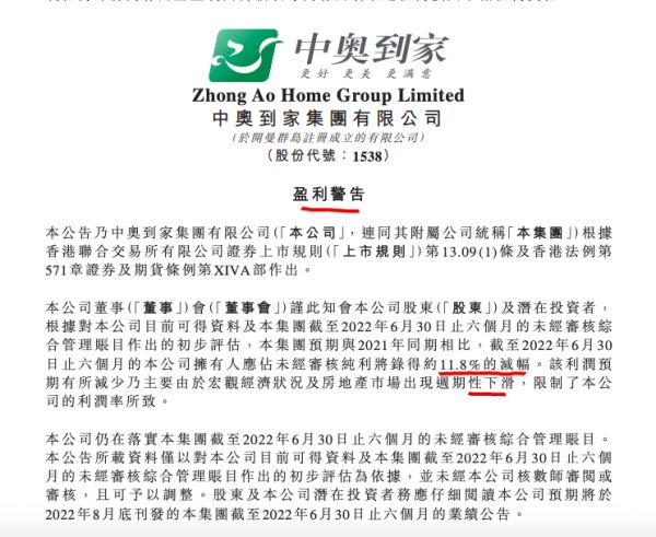 中奥到家:因房地产影响预计上半年纯利同比减少约11.8%