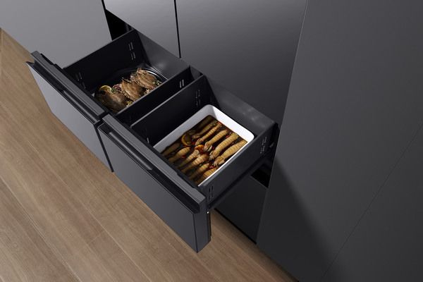 比如老板创造性地做了一个冷烹饪区域,可以让中高端家庭实现专业化的冷烹饪;将嵌入式冰箱的厚度做到了580,将压缩机移到顶部,做到453L的超大容量;内部置物架换成了航空铝合金。