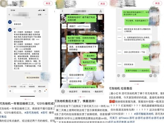在小红书上搜索“洗地机售后”,可以看到很多用户对各大品牌的吐槽,其中数量较多的问题有:售后维修电话打不通;客户只会敷衍回复但不能解决问题;出了问题换新结果是别人用过的;更有用户修了几次没修好,商家也不肯退,最终历经艰难靠12315投诉才成功退货……