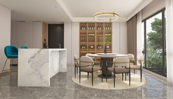 吧台与餐桌组合,实现餐厅空间的多功能化,细节处的落差设计,增强层次感。CBD家居·黑金 | HG571餐桌,圆面餐台叠加转盘设计,实现美感与实用性的平衡,彰显生活品味。