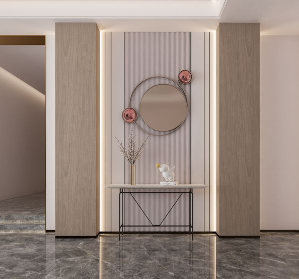 玄关端景设计精美,实现空间的自然过渡,墙饰与置物桌灵活运用曲直线条设计,营造出优雅的视觉观感,搭配线灯,氛围感更浓郁。