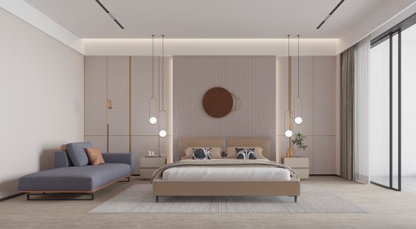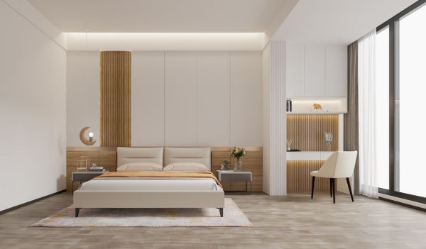 原木色与米灰色自然过渡,赋予空间流动感与质朴感。墙柱隔断,空间布局满足基础功能而不显拥挤。CBD家居·金豹 | J051软床,米色温柔高级,甄选皮质提高整体格调,简约而不质感.