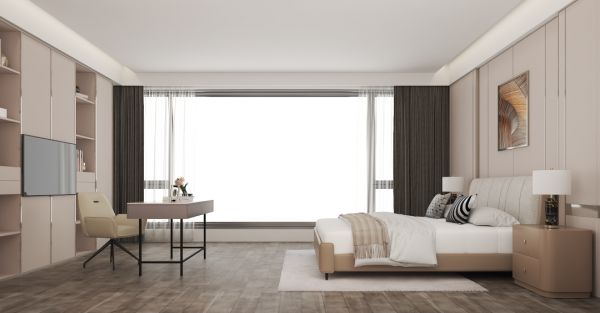 睡眠区与工作区不设隔断,空间更显通透宽阔。定制柜收纳有序,简易书桌线条流畅干净。
