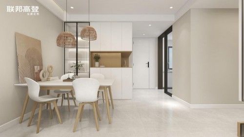 进门既是玄关门厅与餐厨空间的相连接;入户柜造型简单大气,上部开放格设计为用餐地作隐约露出,一眼望进空间通透于心。