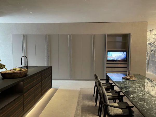 而当你打开每一组高柜的时候,内部的功能,是和外面的场景相互呼应的。比如说对着餐桌的内部电视机柜,它是功能柜的组成部分,同时也在合适的空间,起到了合适的作用。