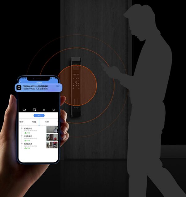 此外必达F3Pro X智能锁在AI智能猫眼的细节功能上也做了进一步优化,搭配142°、1080P广角摄像头,保证足够的拍摄范围且不失真。再加上双红外补光3m夜视功能,猫眼镜头对环境光的感知更加敏锐,白天黑夜都清晰,能够轻松应对各种生活场景。在门外有人异常逗留或门锁被撬时,必达F3Pro X智能锁会立即启动录像并将警报消息推送到手机,猫眼收录的视频会进行加密并上传到云端,相当于为自己的家安排了一个24h的智能警卫,全方位守护居家安全。