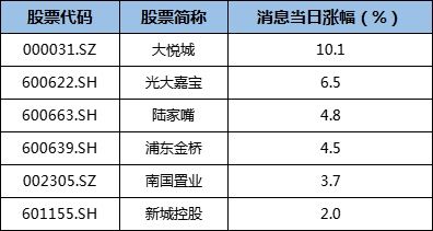 消息一出,商业地产板块闻风异动。大悦城(000031)(000031.SZ)的股价当日即收盘涨停,光大嘉宝(600622)(600622.SH)、陆家嘴(600663)(600663.SH)、浦东金桥(600639)(600639.SH)、南国置业(002305)(002305.SZ)、新城控股(601155)(601155.SH)等跟风上涨。