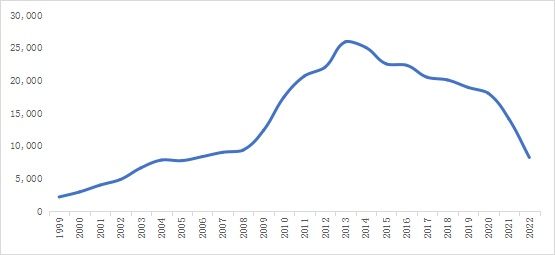 图表3:1999年-2022年商业营业用房开工面积(万平方米)