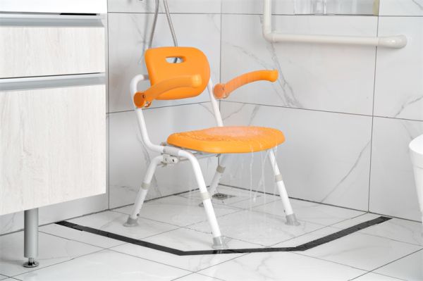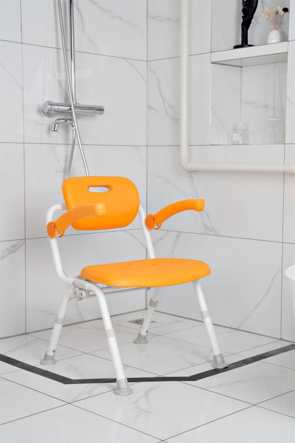 折叠淋浴椅的坐垫、靠背均采用多孔式设计,既防滑,又便于拆卸清洗。选用柔软的EVA树脂材质包裹,触感亲肤柔软,防滑耐磨。产品整体衔接处采用圆角处理,配件采用内嵌式设计,使用更加安心。淋浴椅有橙色、蓝色、棕色三色,用户可根据自身视力情况选择更敏感的颜色,即使在水雾大起的浴室,也能一眼注意到。