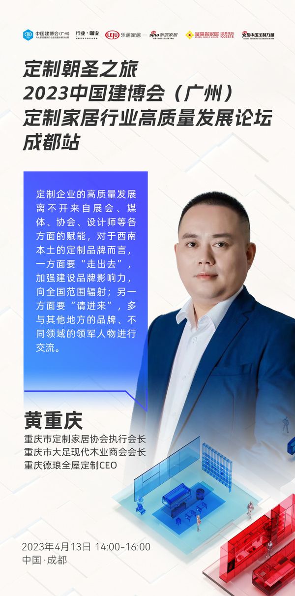 重庆市定制家居协会执行会长、重庆市大足现代木业商会会长、重庆德琅全屋定制CEO黄重庆:定制企业的高质量发展离不开来自展会、媒体、协会、设计师等各方面的赋能,对于西南本土的定制品牌而言,一方面要“走出去”,加强建设品牌影响力,向全国范围辐射;另一方面要“请进来”,多与其他地方的品牌、不同领域的领军人物进行交流。