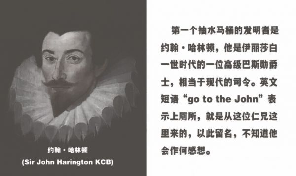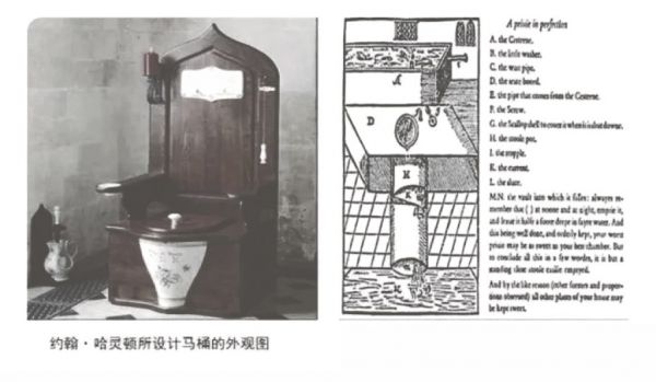 这个世界上第一个抽水马桶名字叫“Ajax”,就是厕所的意思。MDQ约翰·哈林顿于1956年出版了一本书,专门教人们自行打造抽水马桶。这就是现代马桶的原型,有一个储水箱,如厕后通过冲水将排泄物冲走。哈灵顿是伊丽莎白一世女王的教子,也就是养子的意思,他送了他干妈一个这样的抽水马桶,但据说因为噪音太大、臭味太大,女王没有用。同时因为这个抽水马桶使用直线型的管子连接污水管,恶臭能畅通无阻地顺着马桶进入房屋。所以这种抽水马桶并没能在德国得到推广。