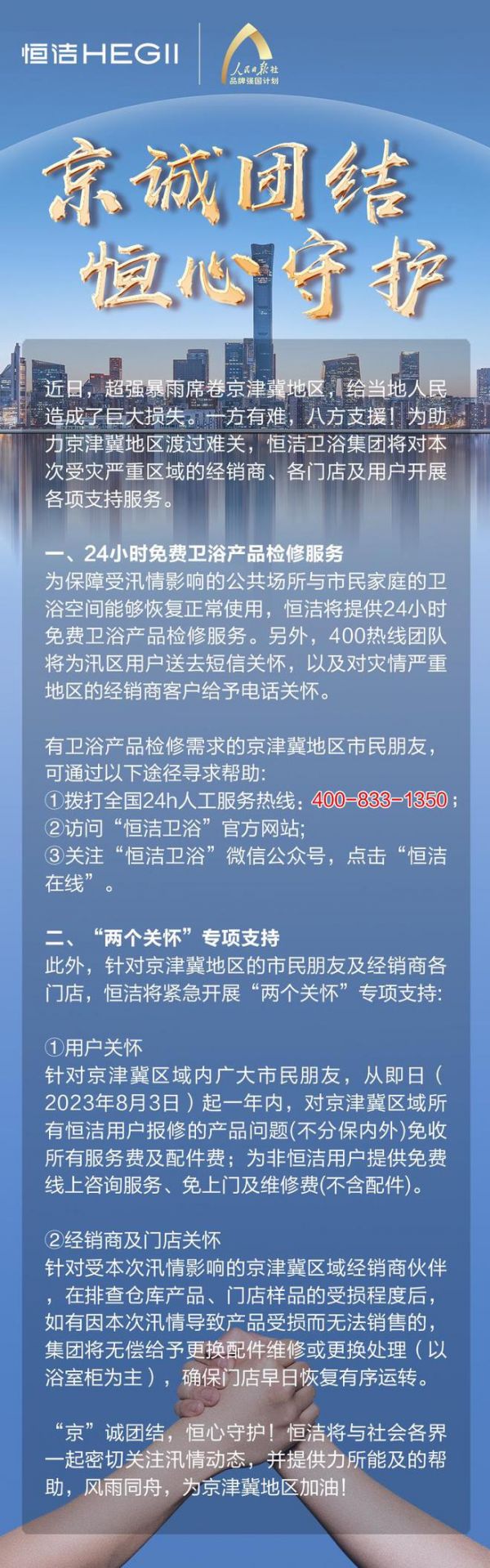 近日,超强暴雨席卷京津冀地区,给当地人民造成了巨大损失。一方有难,八方支援!为助力京津冀地区渡过难关,恒洁卫浴集团将对本次受灾严重区域的经销商、各门店及用户开展各项支持服务。