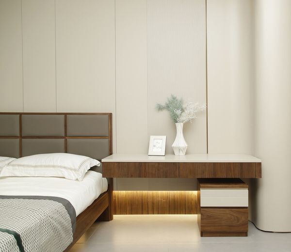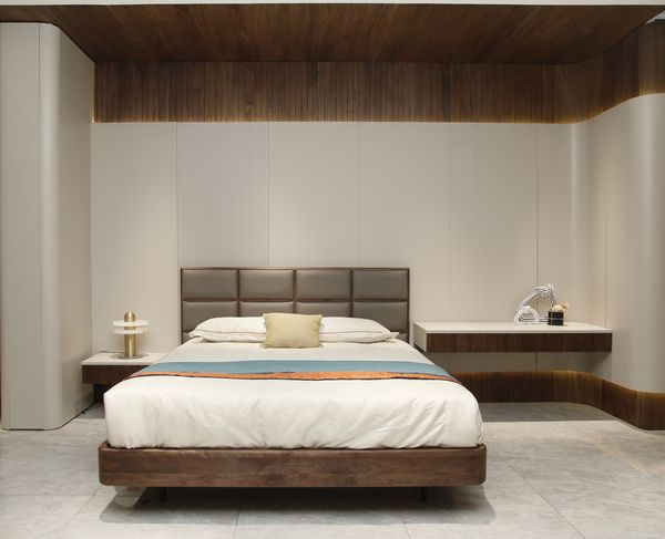 黑胡桃实木的胡桃色+真皮床屏的星空灰,充满艺术感与自然活力,在静谧氛围中营造令人心动的生活美学,让居住者可以带着理性与冷静沉浸于思考,亦可以在慵懒与虚度中消磨着时光。