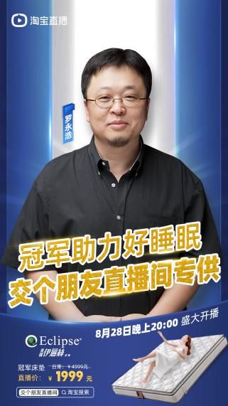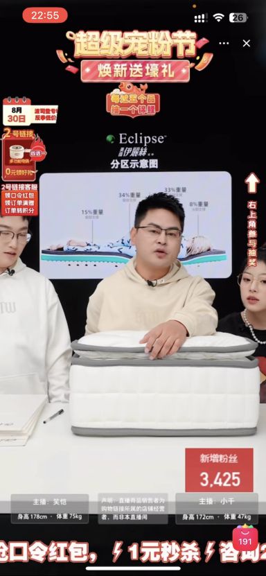 8月28日,百年床垫品牌Eclipse伊丽丝床垫与交个朋友直播间合作开启了品牌大促序幕,在此之前6月伊丽丝床垫已经与张兰直播间合作,伊丽丝也凭借好产品和好口碑,受到直播间众多观众的认可,开启了伊丽丝战略转型的关键第一步。