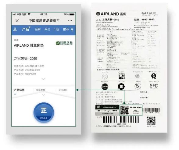 在购买雅兰产品时,消费者可以通过智慧防伪溯源系统查询真伪,每张床垫的ID都具有唯一性,扫描即可查看防伪码,让雅兰出品的每一件正品都有据可查,避免上当受骗。消费者也可以用手机微信扫描产品洗水唛防伪码,跳转至“中国家居正品查询平台”查询产品真伪。