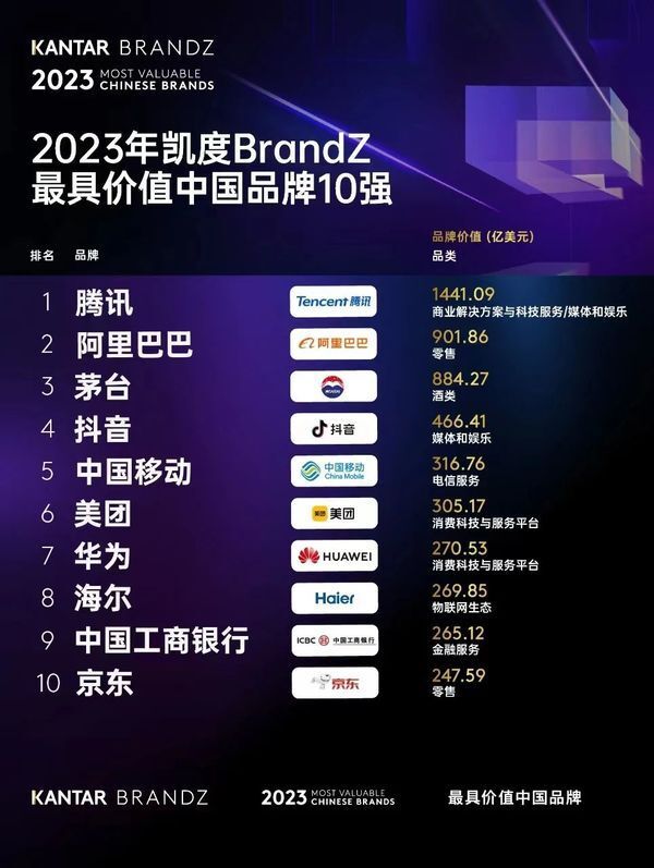 BrandZ:阿里、腾讯领先,海尔、华为上升,抖音首上榜