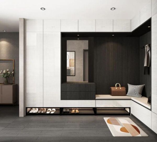 柏厨醉花间II系列玄关处,采用更贴合户型格局的L型设计,深色木纹与白色相接,典雅质朴,简约大方,内侧有小灯照亮实用满分还能增加氛围感,一侧设有半身镜和专属换鞋区,出入都能保持最好的状态,一侧设有挂钩方便日常进出的外套、围巾等挂放,镜子下方的小平台,让小东西也有处可放,不用手忙脚乱。