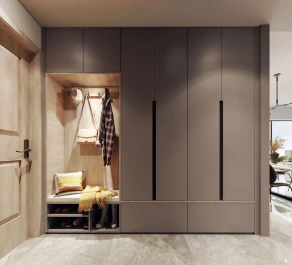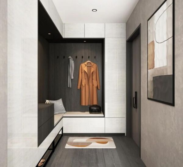 柏厨礼居II系列设计就很好的诠释了何为艺术与功能兼顾。在玄关设计上,柏厨礼居II采用了嵌入式隐藏柜,一方面避免了庞大柜体给人带来的视觉上的压抑,降低玄关橱柜的存在感,让人入户时拥有一个平整、简洁的视觉体验。在靠近门的一侧,打造了临时挂衣区,巧妙利用下方空间安装了悬空换鞋凳,下方空间也毫不浪费,可以分别容纳不同尺寸的鞋子,力保整洁与干净。