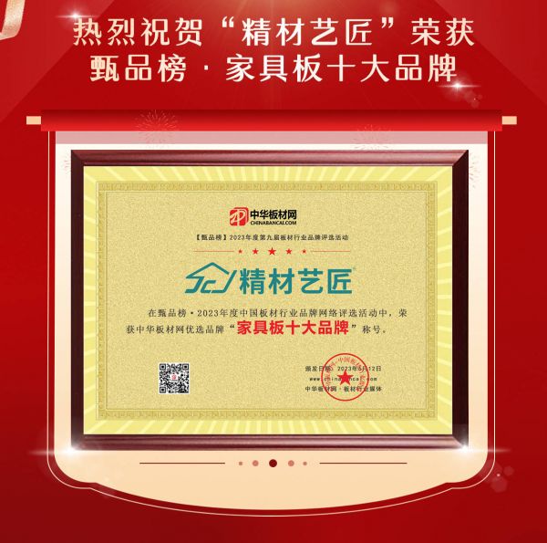 近日,由中华板材网发起的《甄品榜·2023年度板材行业十大品牌评选活动》公布了家具板十大品牌榜单,精材艺匠板材凭借卓越的品质和服务,成功荣获甄品榜“2023年度家具板十大品牌”荣誉称号。